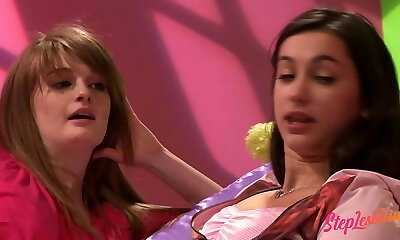 Two 19 Year Aged Stepsisters Participate in a Hot Lesbian Orgy with Their Lecherous Busty Educator!