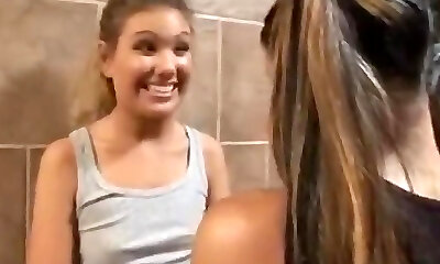 Naughty coed femmes have fun in the toilet while teasing raw pussies